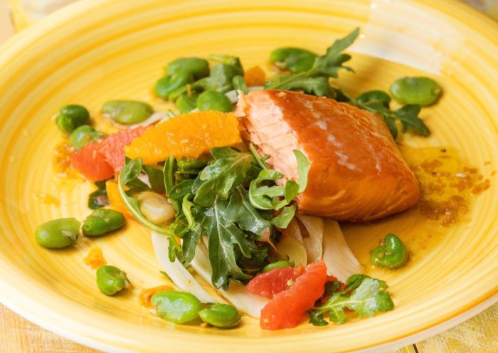 HOT SMOKED SALMON SALAD WITH FAVAS, FENNEL, CITRUS AND ARUGULA