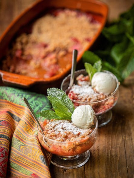 Dump the rhubarb mixture into a 6-cup gratin dish and sprinkle the flour mixture evenly over the top. Bake until the topping is golden brown, about 25 minutes. Let the crisp cool a bit and serve it warm with a dollop of whipped cream or a scoop of ice cream.