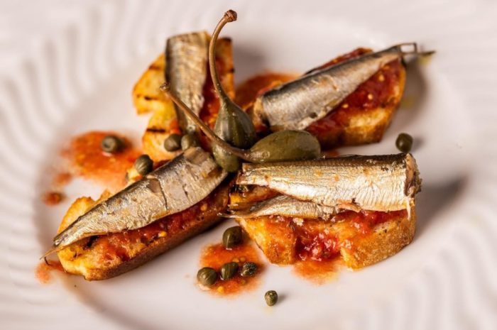 Spoon the tomato mixture over the slices of toast and top each slice with two of the anchovies or your other favorite tinned fish on top. Drizzle with a little more oil and serve.