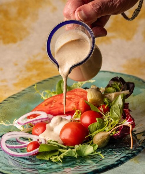 Add the olive oil and vinegar to the reserved 2 tablespoons of tomato juice. Drop in the anchovy paste and whisk until emulsified. Alternatively, shake it all up in a jar. Taste for seasoning; it may need more salt or a few cracks of pepper.