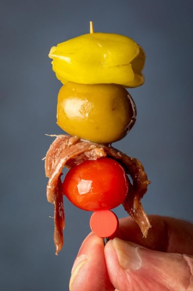 Typically a pickled green guindilla pepper or sometimes a gherkin pickle or sundried tomato, olives and anchovies were all lined up on a toothpick for easy eating.