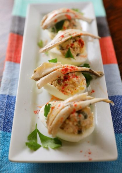 Spoon the yolk mixture into the egg whites. You may have a little more filling than you’ll need which is not a bad thing! Arrange two anchovies on top of each egg and sprinkle with parsley and paprika.