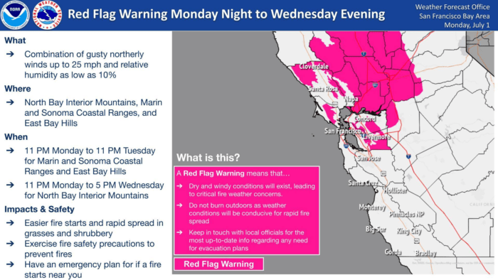 High temperatures are leading to an increased risk of wildfire in Sonoma County. The National Weather Service has issued a red flag warning for elevated wildfire risk in Sonoma, Napa and Lake counties. The warning went into effect at 11 o’clock last night. It will remain in effect through 11 p.m. tonight for Sonoma County’s coastal mountain ranges and through 5 p.m. tomorrow for the North Bay interior mountains.